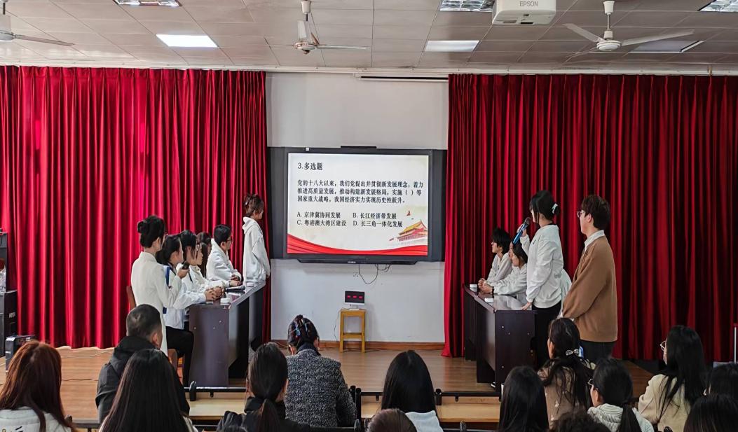 经过前期选拔,来自25级的中药2班、中药3班、中医1班、药膳与食疗班四支代表队突破重围,齐聚决赛现场展开智慧与速度的较量。竞赛内容涵盖党章党史、党纪党规、党的创新理论及时事政策等,全面考察选手理论素养与综合能力。比赛设置“稳扎稳打”必答题、“分秒必争”抢答题、“勇攀高峰”风险题三个环节。必答题环节,选手沉着冷静、对答如流,展现扎实知识储备;抢答题环节紧张激烈,既考验反应速度,也体现团队协作与心理素质;风险题环节策略与胆识并重,各队审时度势、果断出击,将赛事推向高潮。