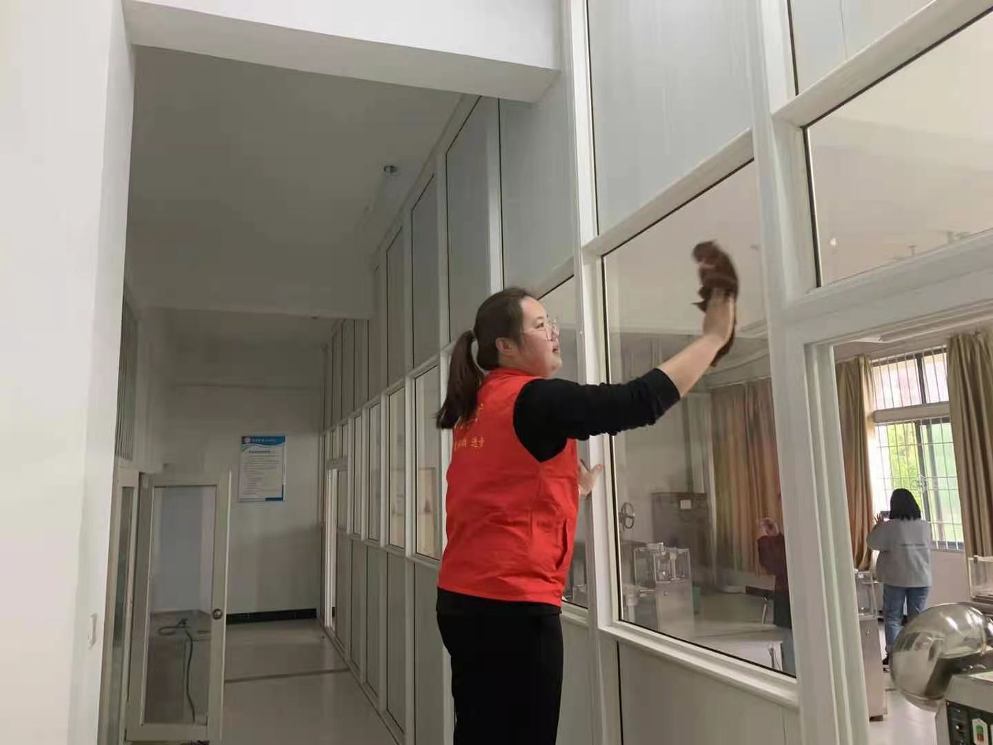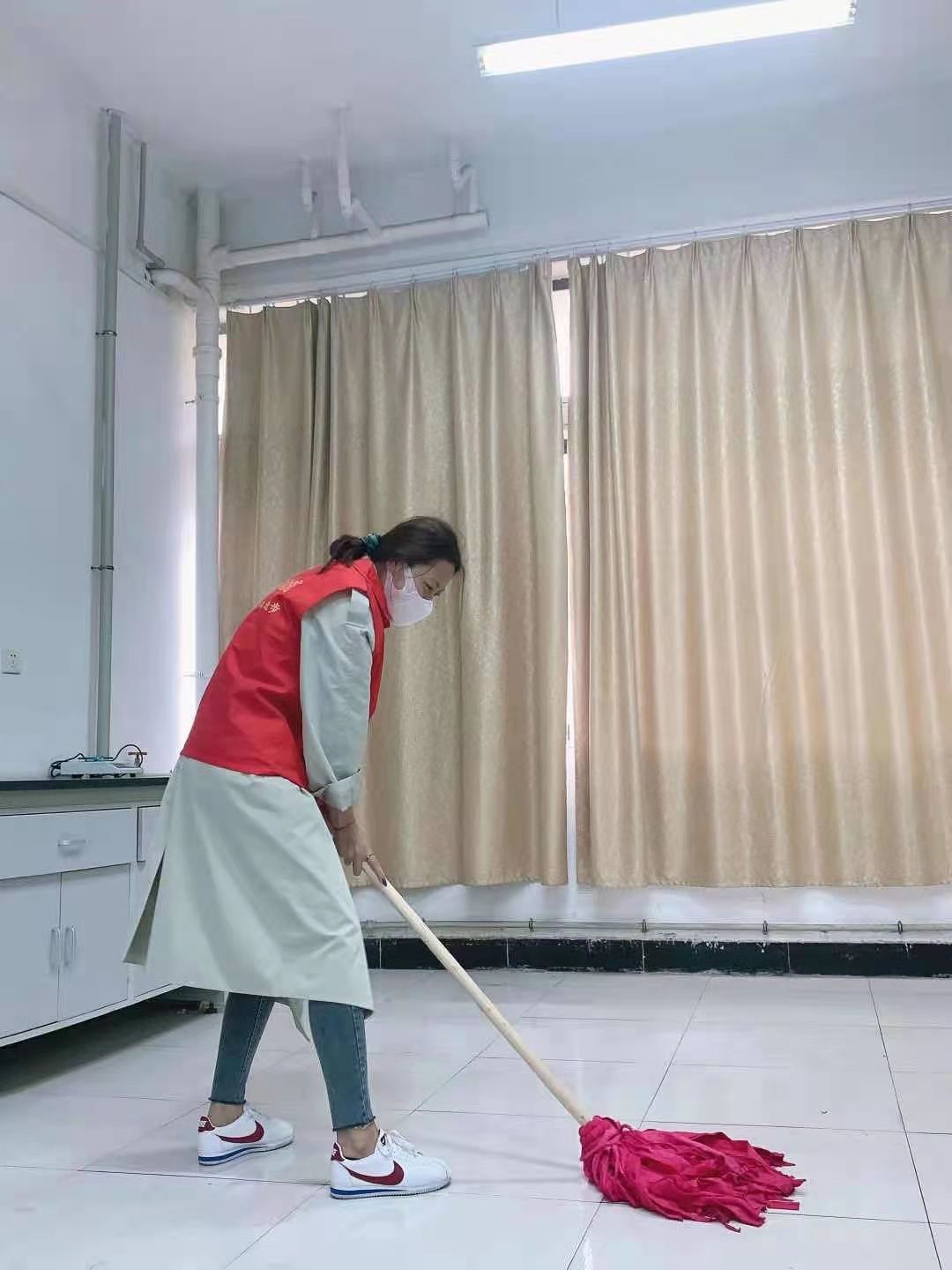 志愿者身穿红色马甲,到达实验楼后,按照老师安排,热火朝天、有条不紊地打扫实验楼卫生。志愿者们有的拿着抹布,认真地清理桌面尘土,窗户污渍;有的拎起扫帚,细心清洁每一个小角落的垃圾;有的扛起拖把,一遍又一遍拂去尘土,将地面打扫得光亮如新,随处可见同学们忙碌的身影。每位党员志愿者都不怕脏,不怕累,让实验室变得更加清洁、亮丽,也为大家营造了良好学习的氛围。