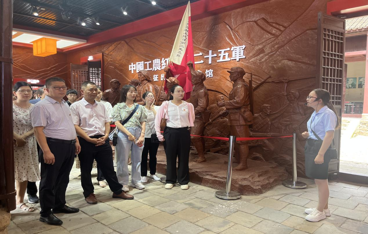 随后,大家前往何家冲红二十五军长征出发地纪念馆,实地参观了何氏祠堂、红军碾等红色革命遗迹,聆听讲解员讲述红二十五军革命的历史,并重走“长征路”,亲身体验了红二十五军在何家冲银杏树下开启万里长征的光荣。