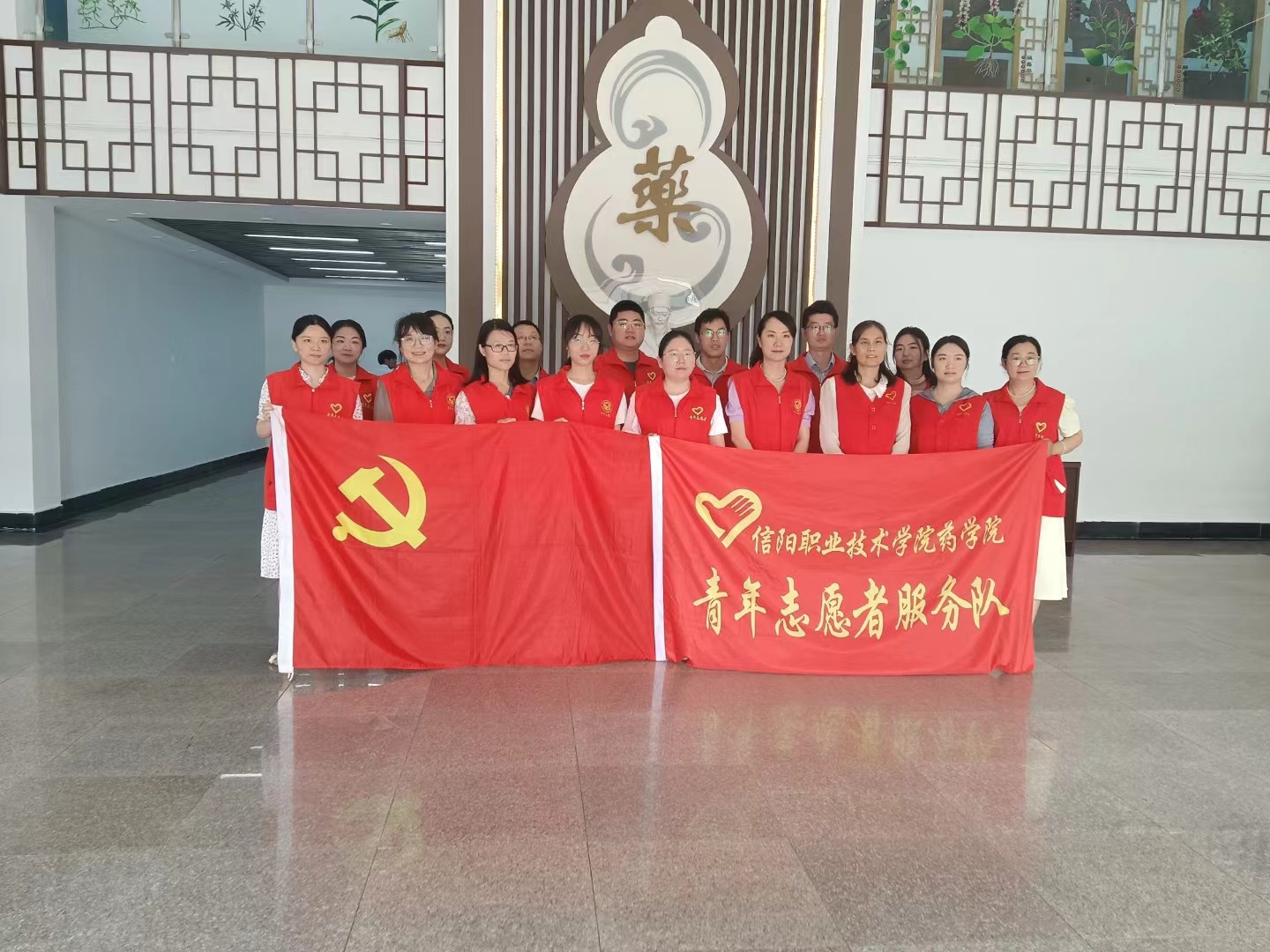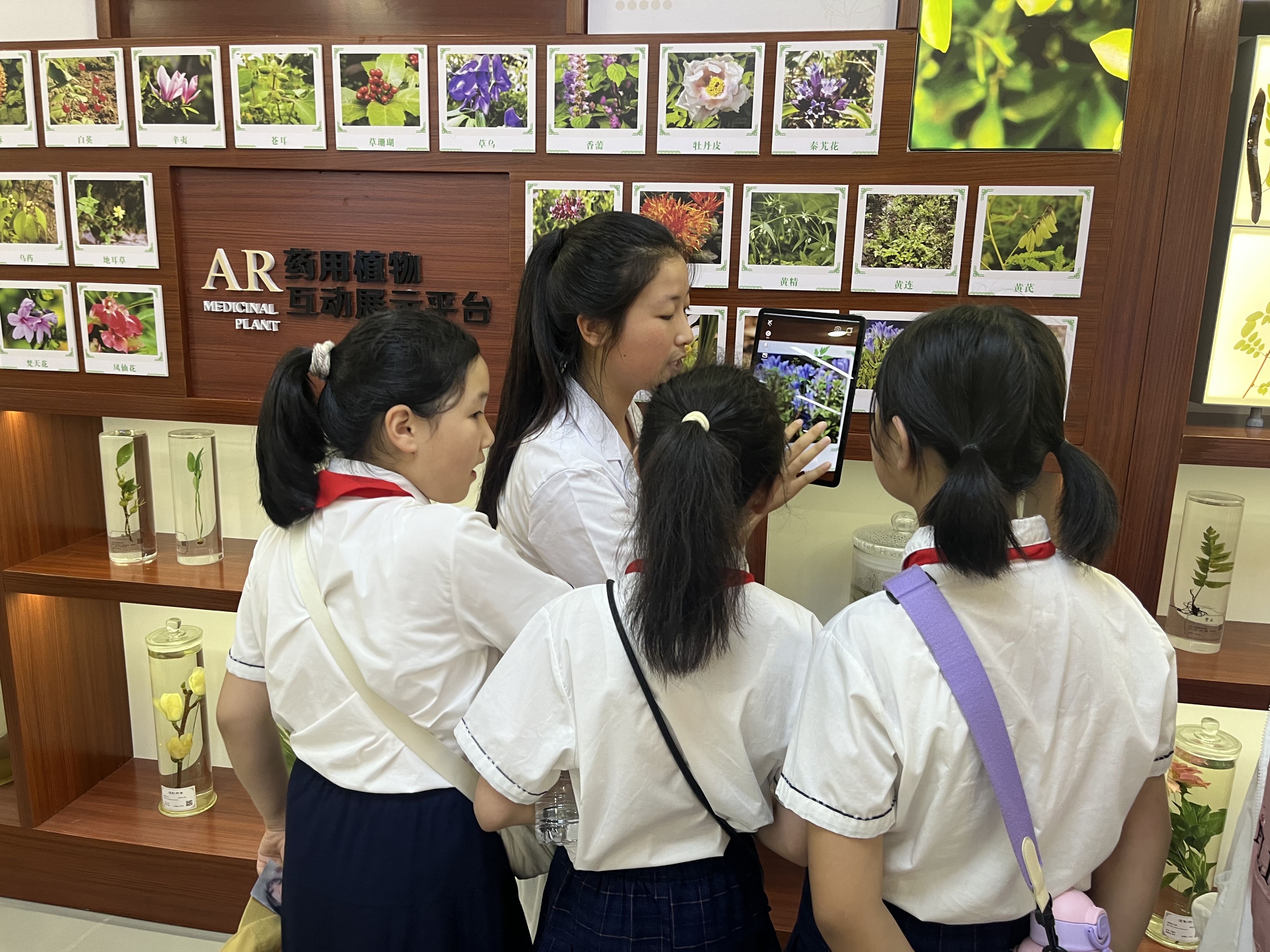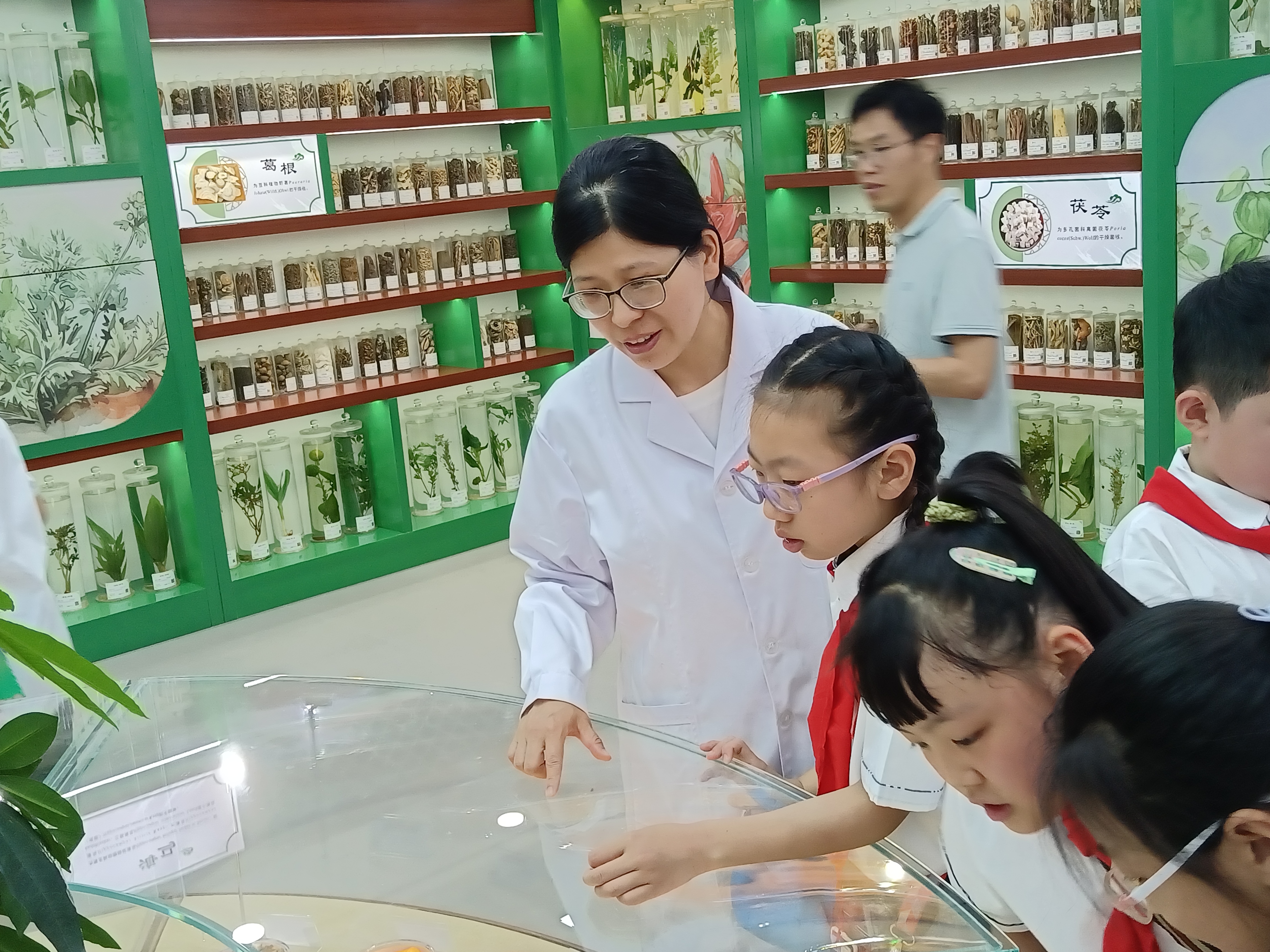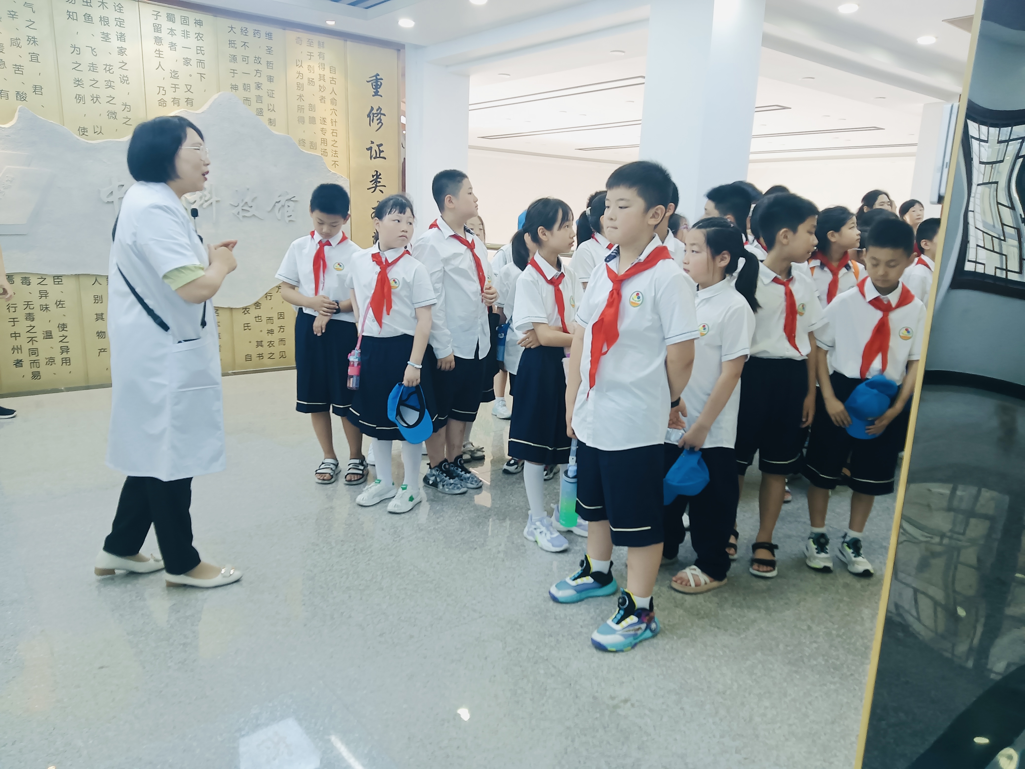 首先,学生们来到中药科技馆进行参观。樊轻亚、张婉晴等老师通过讲问结合、现场互动的形式,介绍了博大精深的中药文化,带领学生们依次参观了中药发展历史、中药标本、VR体验、仿古药房等区域,仿佛置身中药知识的海洋。学生们不仅全神贯注地聆听着讲解,还不时地向讲解员和党员志愿者提问,展现了对中药文化的浓厚兴趣。